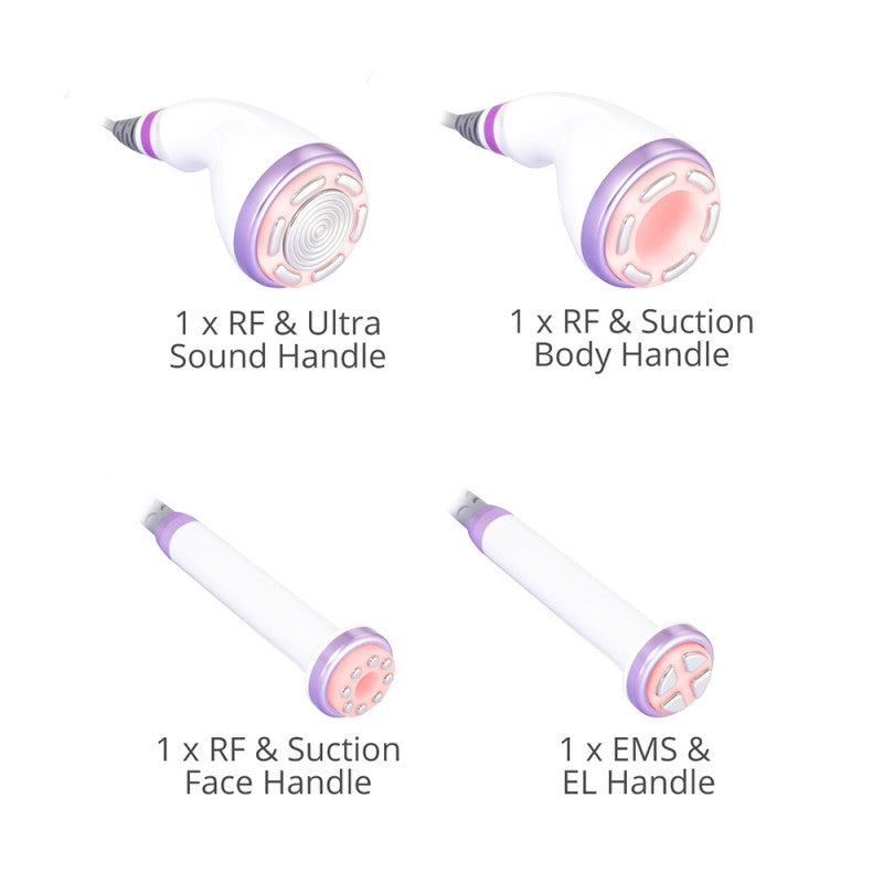 The 40k cavitation handle targets stubborn fat using ultrasonic waves, while RF handles tighten and firm the skin on both face and body. Vacuum RF improves circulation and lymphatic drainage, enhancing detoxification and smoothing cellulite.